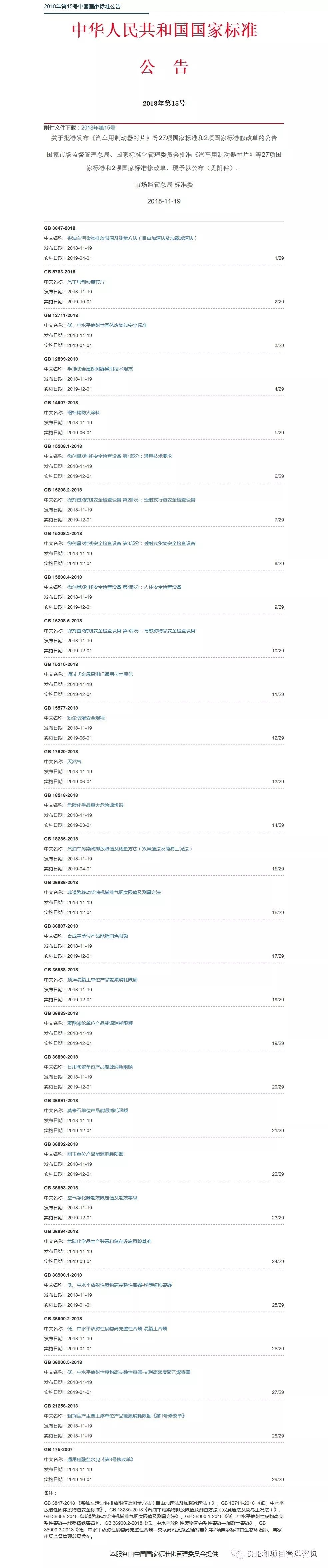 备注:GB 3847-2018 《柴油车污染物排放限值及测量方法(自由加速法及加载减速法)》、GB12711-2018 《低、中水平放射性固体废物包安全标准》、GB18285-2018《汽油车污染物排放限值及测量方法(双怠速法及简易工况法)》、GB36886-2018《非道路移动柴油机械排气烟度限值及测量方法》、GB36900.1-2018《低、中水平放射性废物高完整性容器—球墨铸铁容器》、GB36900.2-2018《低、中水平放射性废物高完整性容器—混凝土容器》、GB 36900.3-2018《低、中水平放射性废物高完整性容器—交联高密度聚乙烯容器》等7项国家标准由生态环境部、国家市场监督管理总局发布。