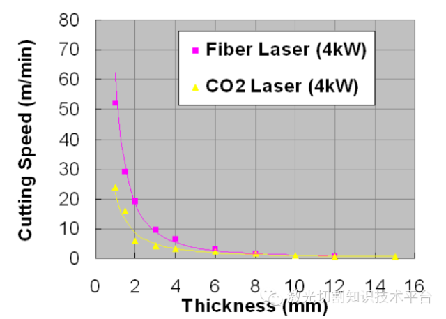 在加工不锈钢材料时,CO2激光加工机和光纤激光加工机的加工速度的比较图。激光的输出功率都是4kW。我们可以看到在板厚4.0mm以下的领域中,光纤激光加工机能够以CO2激光加工机的2~3倍的加工速度进行加工。