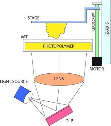 不同的是,DLP是一下子可以成型一个面,而SLA只可以成型一个点,再由点到线、由线到面进行固化,故DLP比SLA要快。二者本质的差别在于照射的光源:SLA采用激光点聚焦到液态光聚合物,而DLP成型技术是先把影像信号经过数字处理,然后再把光投影出来固化光聚合物。