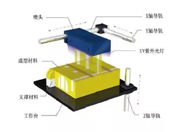 喷头沿X/Y轴方向运动,光敏树脂喷射在工作台上,同时UV紫外光灯沿着喷头运动方向发射紫外光对工作台上的光敏树脂进行固化,完成一层打印;