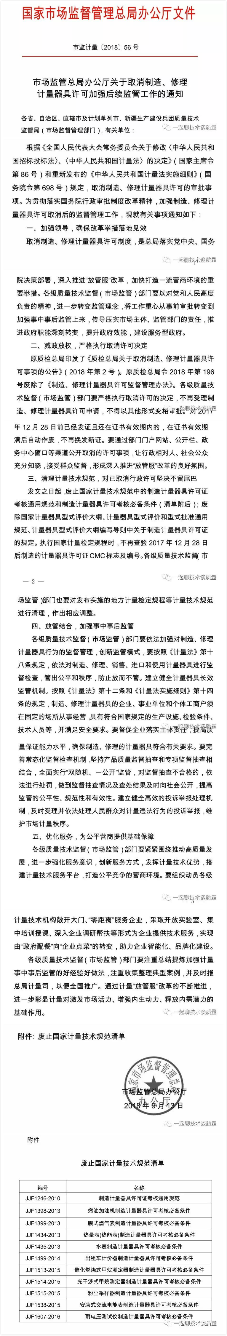 国家市场监管总局办公厅关于取消制造、修理计量器具许可加强后续监管工作的通知